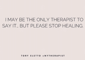 Therapist, Tory Eletto insists that no, we should not stop living in order to “heal” – whatever that might mean – but instead, we should do our healing as we are living. This idea reminded me of a hospice nurse ( Barbara Karnes ) who talks about how dying people are still living people. The two exist together, as odd as that may sound or seem. In the same way, just as we actively live , we actively heal .
