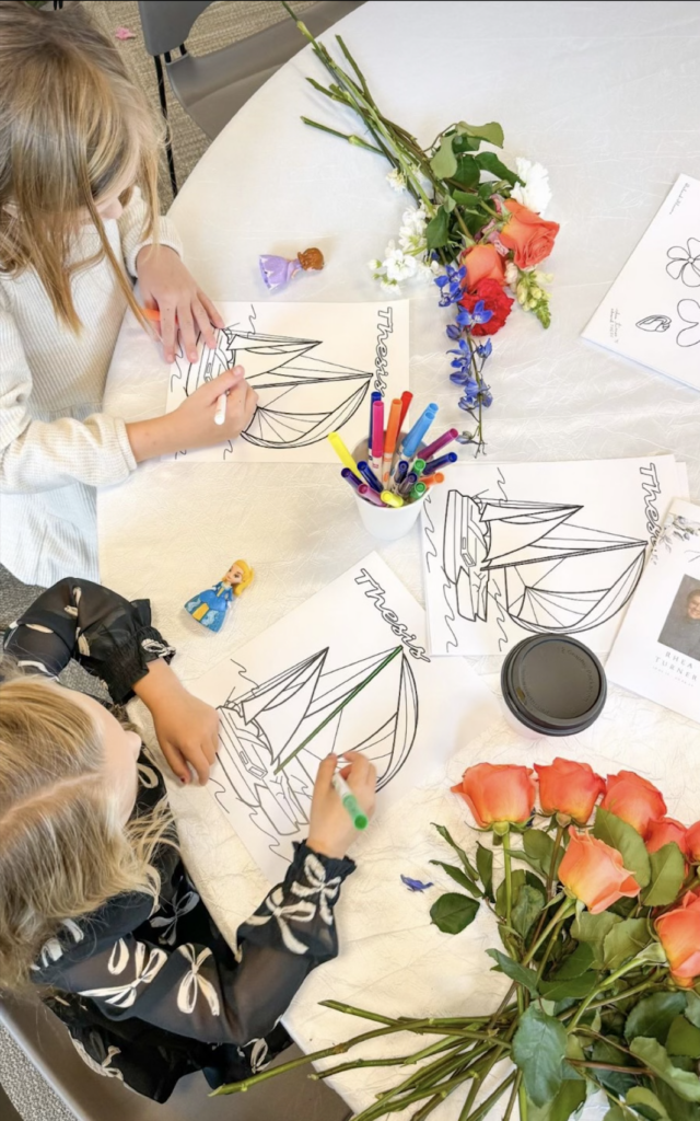 The reception was wonderful. My grandmother was an artist and my cousin brilliantly had coloring pages made from her original art works (amazing, right?). The pages were spread around the tables with markers letting the kids color while we ate and visited. There were also two long tables featuring highlights from my grandmother’s life. Pictures, favorite flowers, her watercolors, tokens and memories were set out for the kids to look at and ask after. We got to tell so many of her stories to them. My aunt also had postcards of her paintings bound together in bundles for guests to take away with them. It was simple, sweet, and in every way comfortable and appropriate for the kids.
