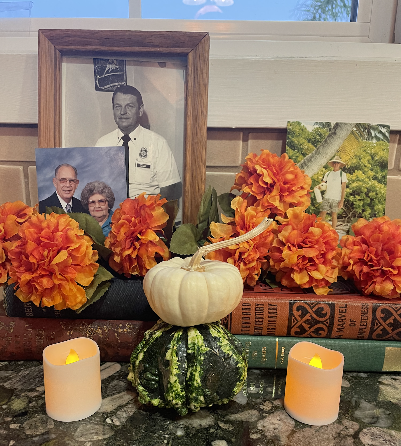 We stacked some books, picked favorite photos, and put marigolds and flameless candles around the display. It’s simple and small but it feels huge and precious to me. Picking photos was truly delightful. I found new pictures and saw old favorites. The act of going through photos to pick just the right one is itself, an incredibly special and sweet experience. So many memories to relive and freshly share.