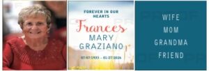 Husband – George Graziano/ They were married for 71 years Children – Laura Poore / Paula Hagen / George Graziano Sons in Law- Lenny Poore and Thom Hagen Grandchildren: Tyler Hagen / Mitchell Hagen / George Graziano / Gianna Graziano In addition to having many cousins and friends she had met throughout her life.