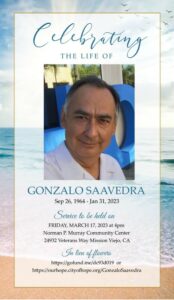 Gonzalo “Gonzo” Saavedra, 58, Rancho Santa Margarita, California 31.JAN.2023 has passed away after a long struggle with esophageal cancer. He was surrounded by family and friends.